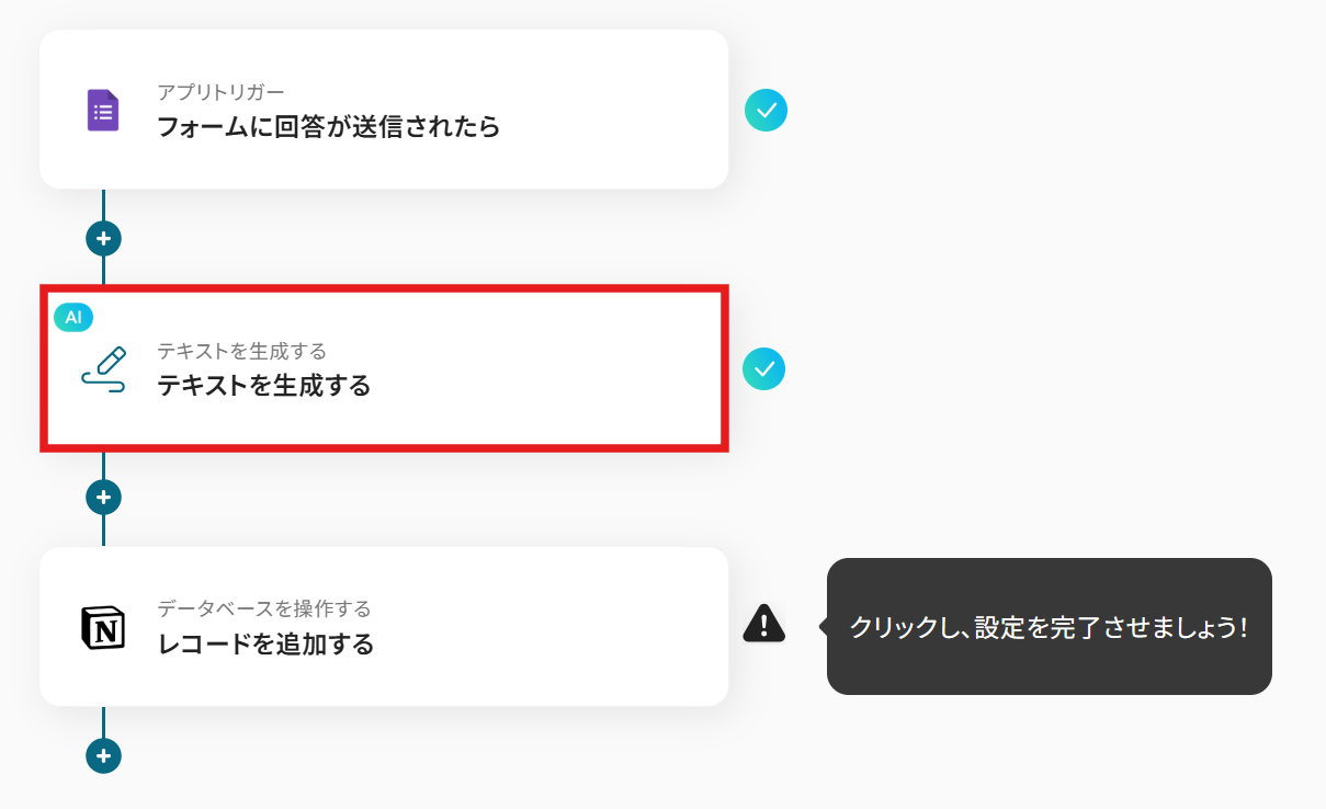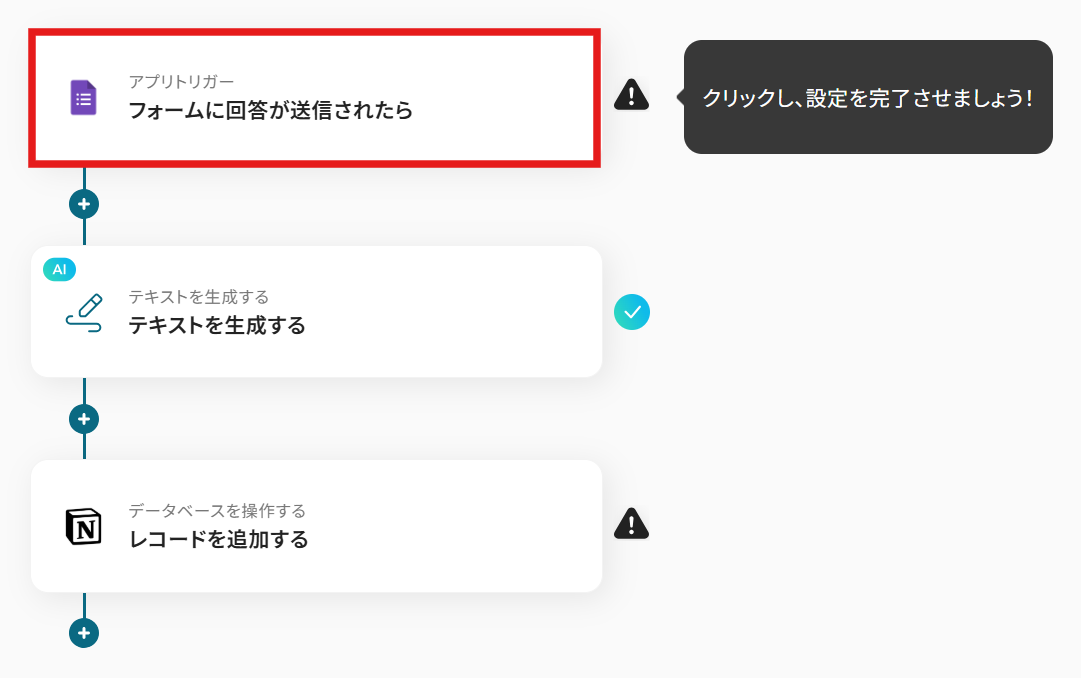 - Googleフォームのトリガー設定、テキスト生成AIとNotionのアクション設定