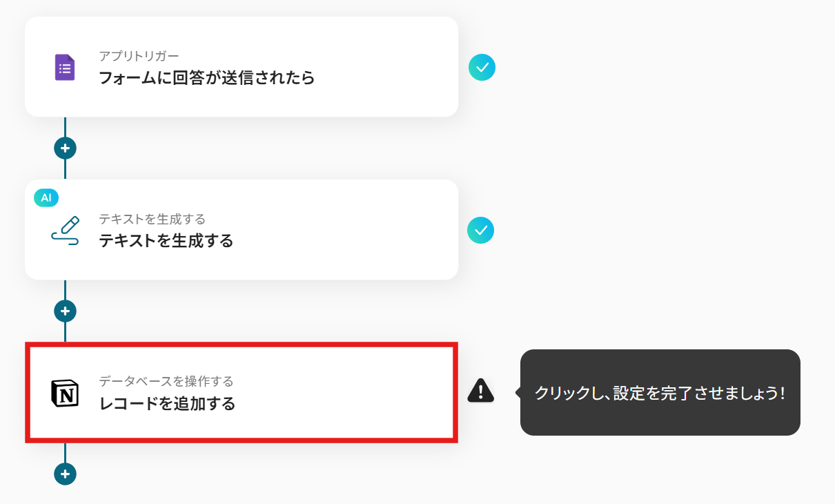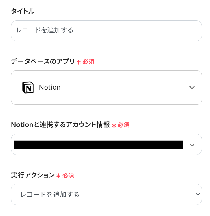 - 最後に、オペレーションとしてNotionの「レコードを追加する」アクションを設定し、AIが生成したストレスチェックの結果やフォームの回答内容を指定のデータベースに追加します。