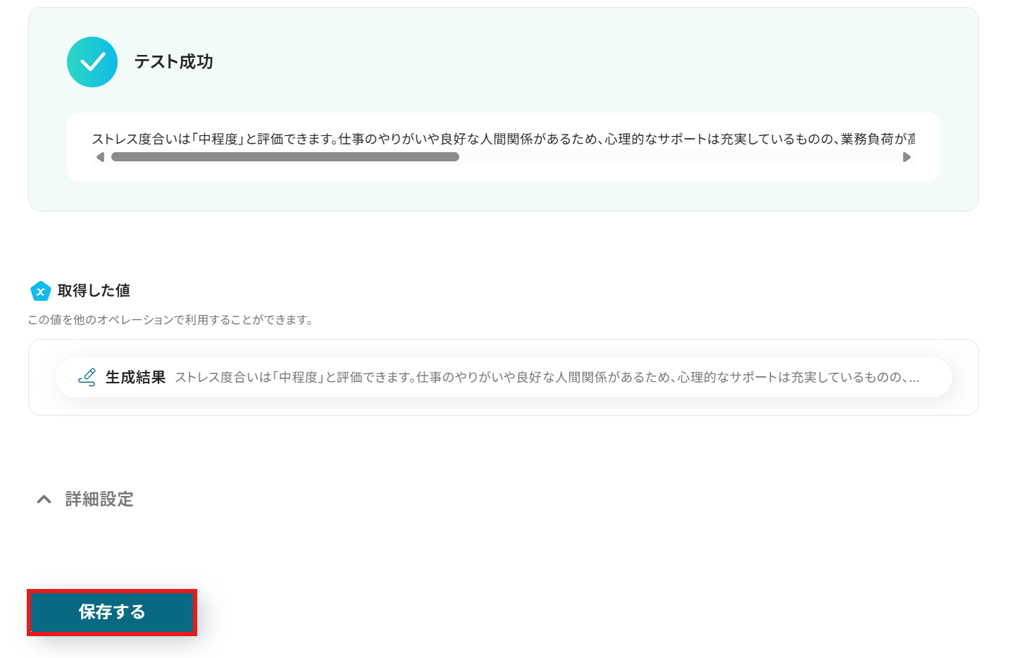このワークフローを活用すれば、フォームが送信されたタイミングでAIが自動で内容を分析(例:ストレスチェックなど)します。