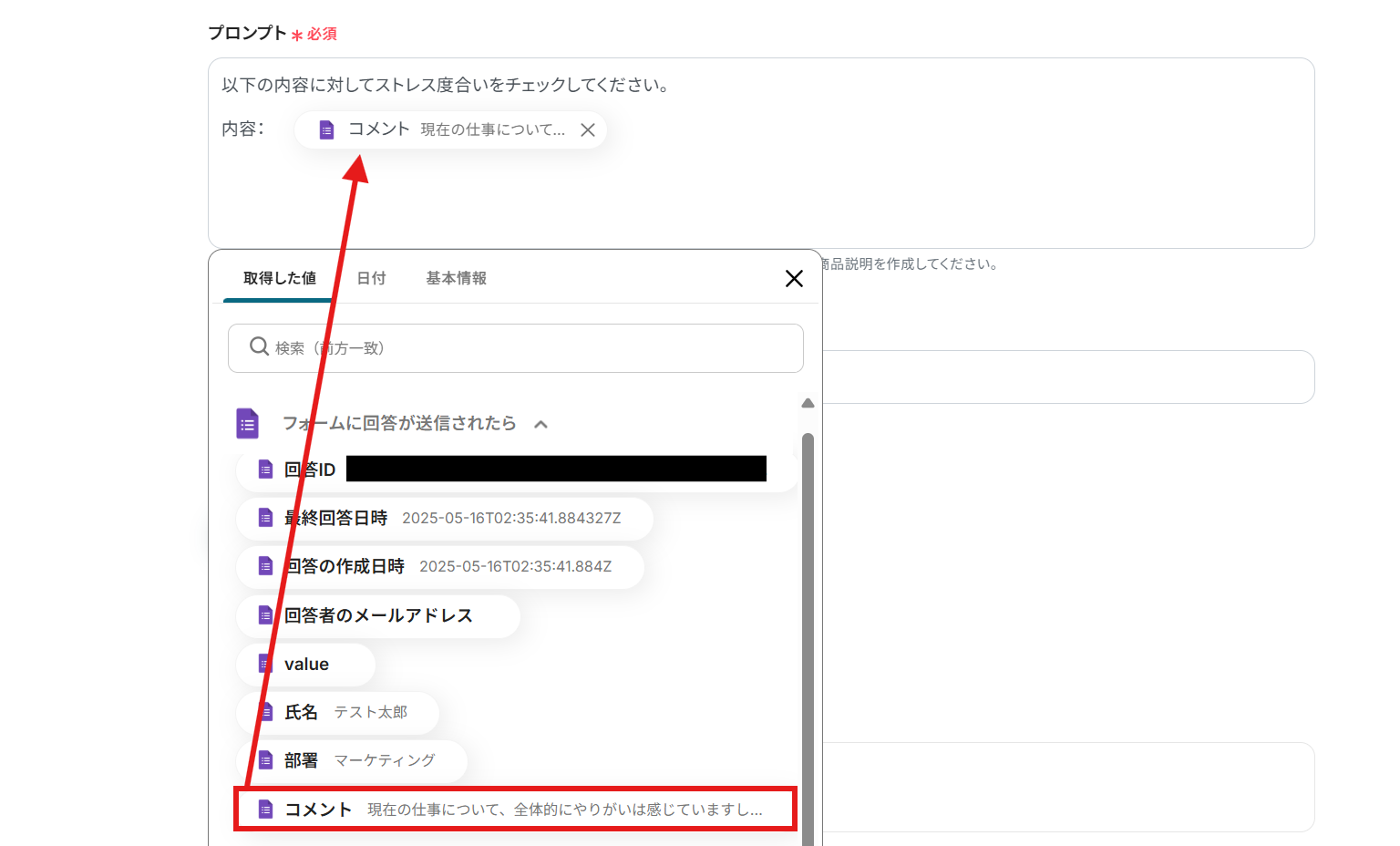 - AI機能のオペレーションでは、ストレス分析を行うためのプロンプトを自由にカスタマイズできます。Googleフォームの回答項目を変数としてプロンプトに組み込むことで、よりパーソナライズされた分析が可能です。