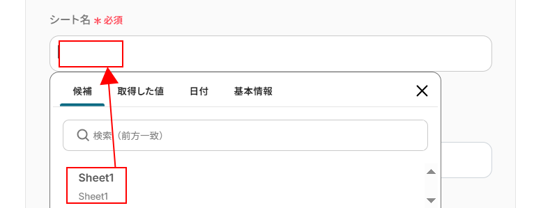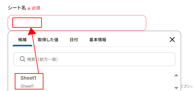 入力欄をクリックし、表示された候補の中から使用しているシート名を選択してください。
