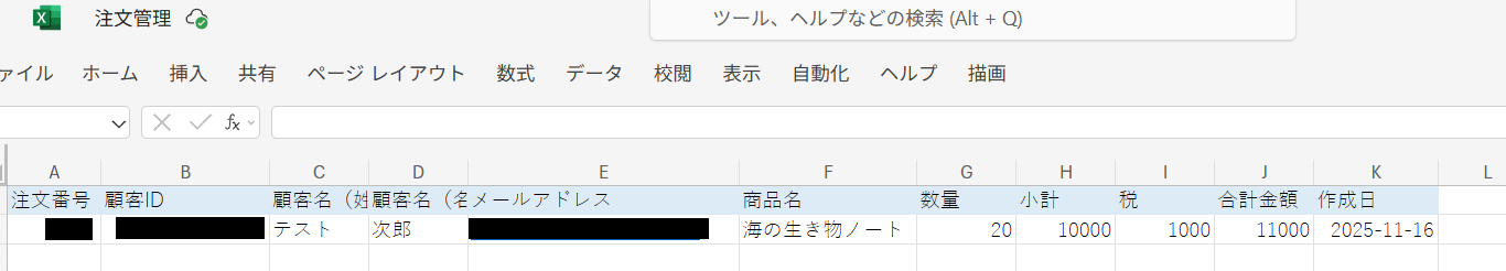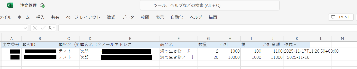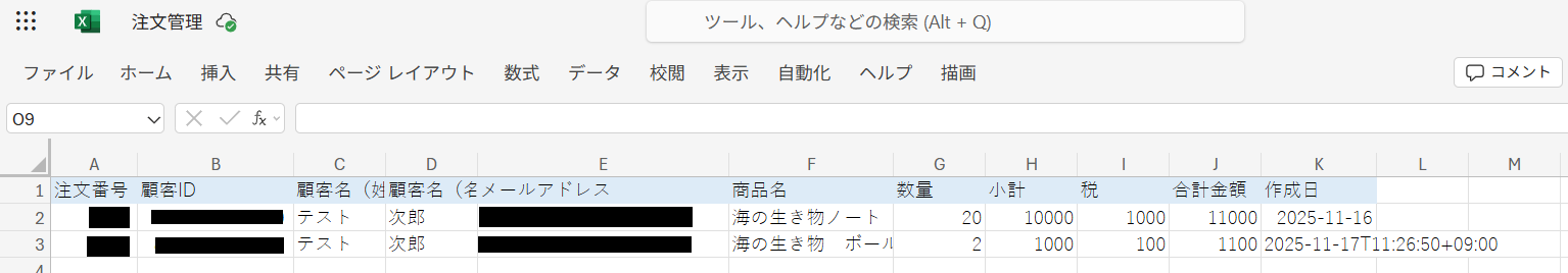 また、Microsoft Excelにレコードが追加されていますのでご確認ください。