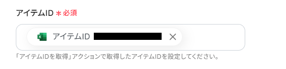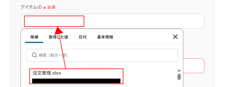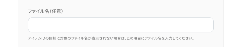 ・ファイル名(任意):アイテムIDにアイテムが表示されない場合は、こちらにファイル名を入れて再度アイテムIDを選択してください。