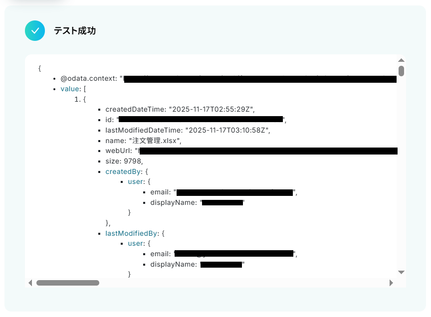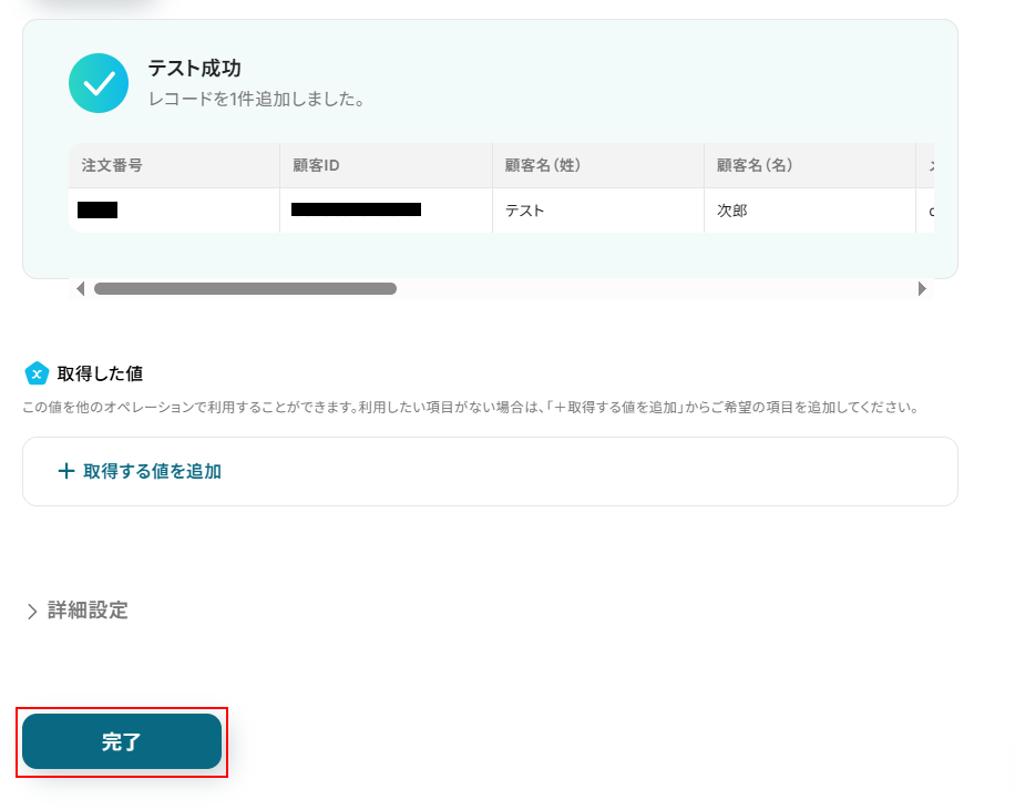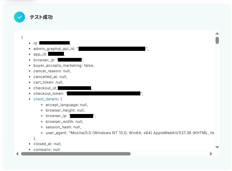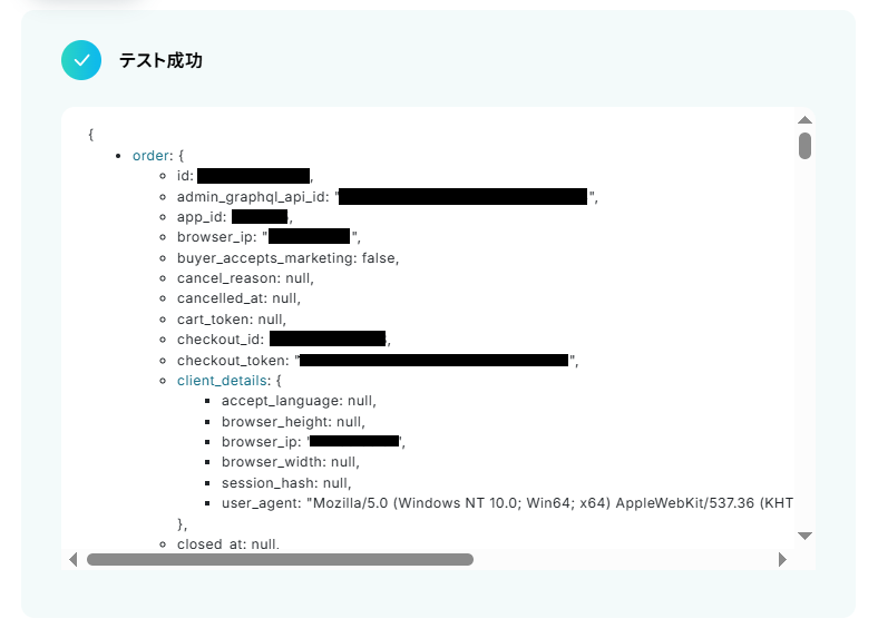 テストに成功するとテスト成功画面と取得した値が表示されますのでご確認ください。