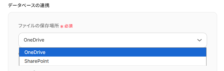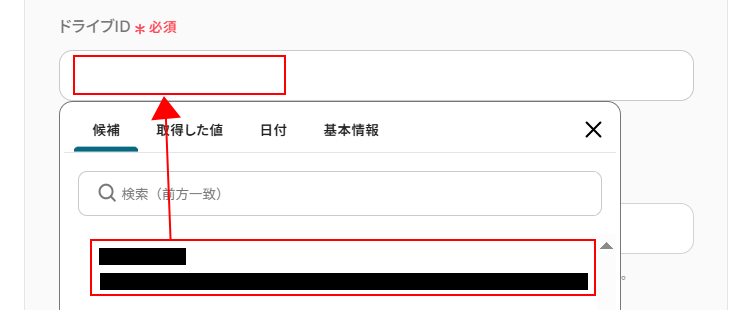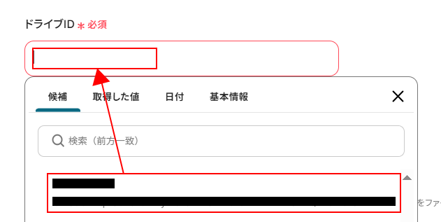 ・ドライブID/サイトID:欄をクリックし、OneDriveの場合はドライブID、SharePointの場合はサイトIDを選択します。