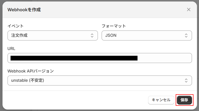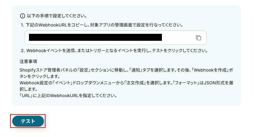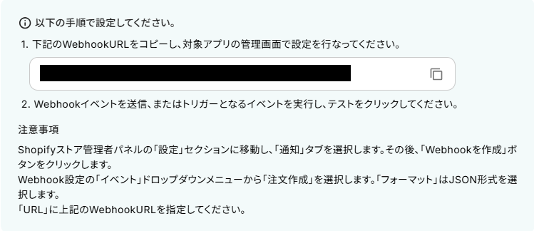 WebhookURLをコピーし、Shopifyの管理画面に移動したら注意事項に記載されている通りにWebhookを作成します。
