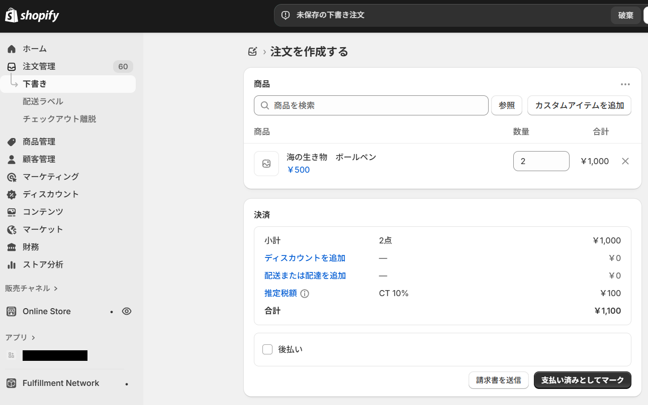 Webhookの設定ができたら、実際に注文を作成しましょう。
