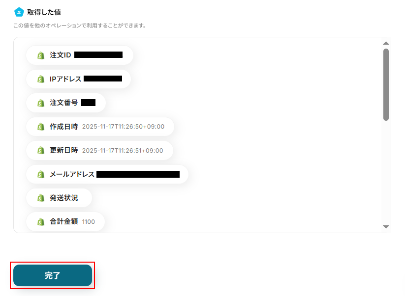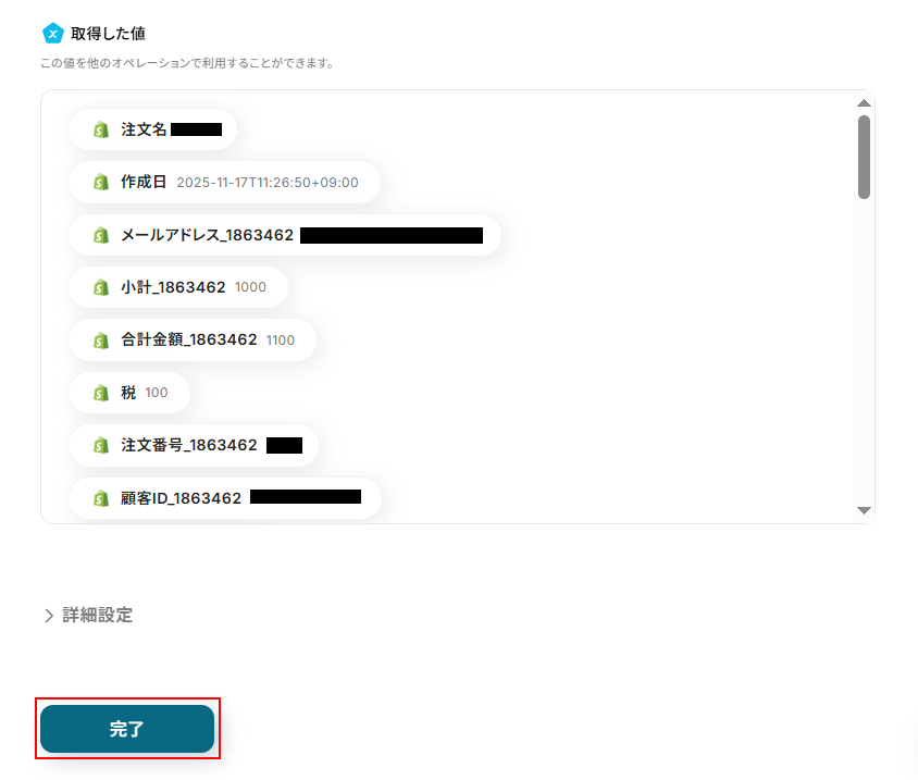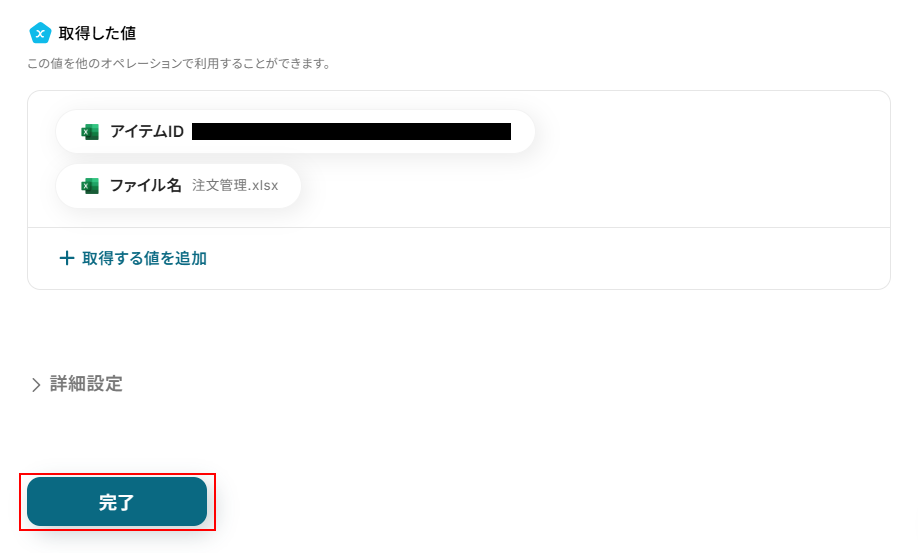 取得した値は実行した結果が設定される動的な値として利用できるため、このあとの設定でも使用します。