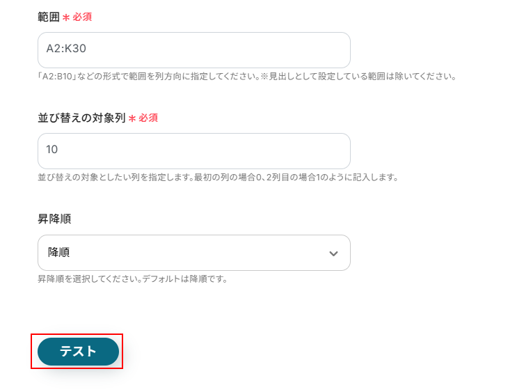 全て設定できたらテストをクリックしましょう。