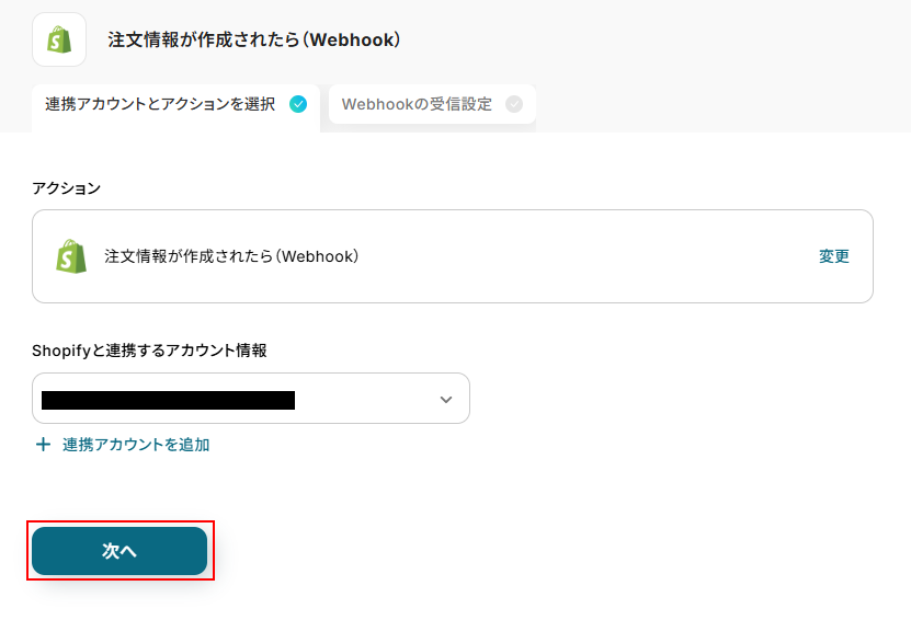 注文情報が作成されたら(Webhook)をクリックします。