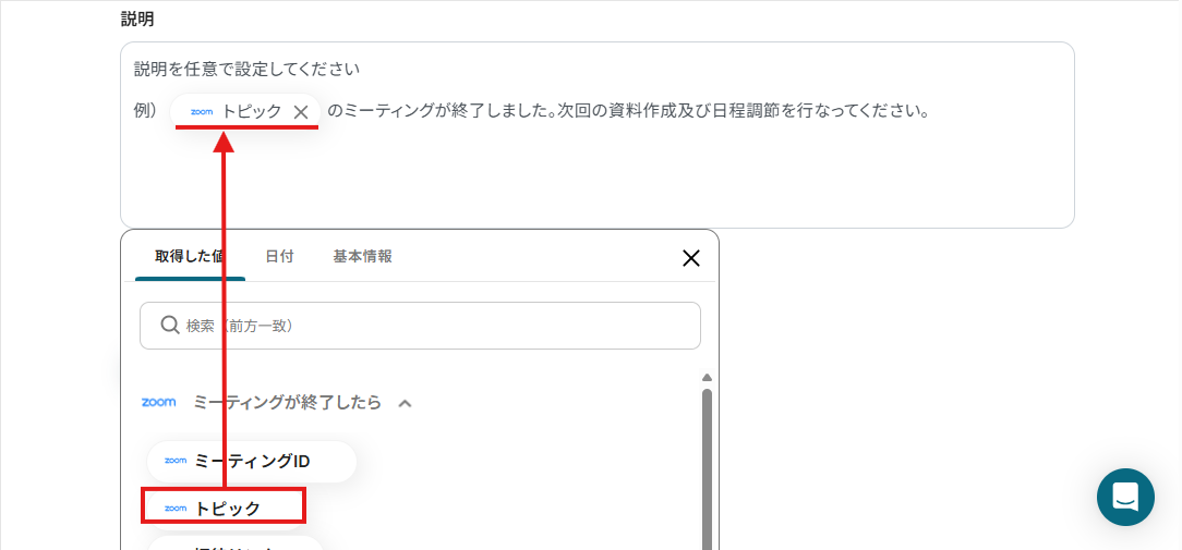 このように設定すると、Zoomのミーティングが終了したら「トピック」を自動で取得し、Trelloの説明に引用することができますよ!