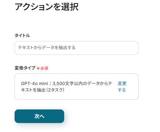先ほどと同様にタイトルと連携するアカウント情報を任意で設定し、アクションはテンプレート通りに「タスクを追加」のまま「次へ」に進みます。