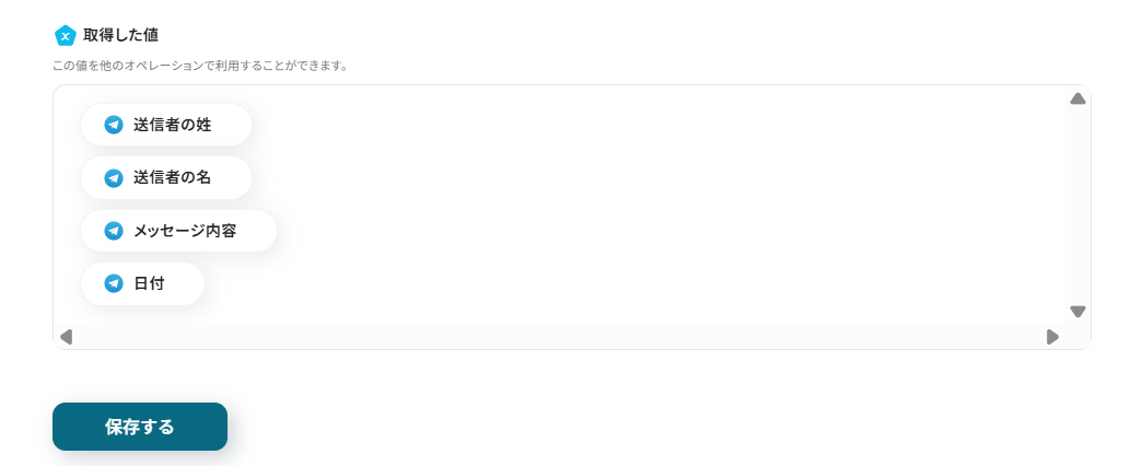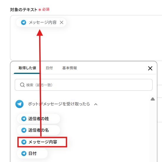 Telegramの投稿から取得するため、Telegramのアウトプットから「メッセージ本文」を選択してください。