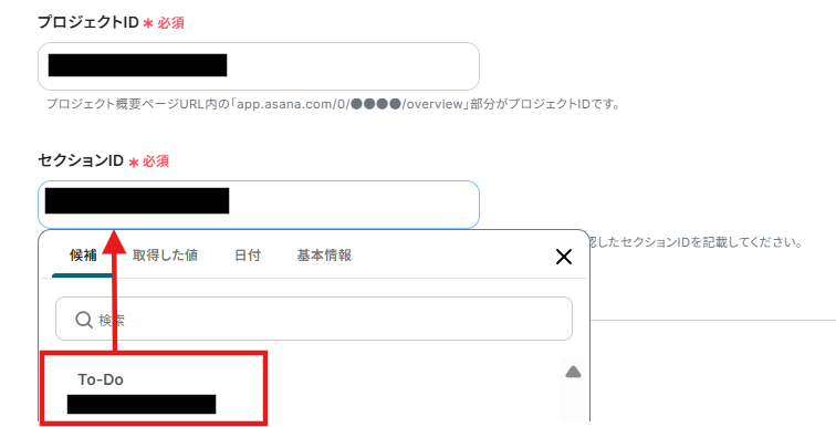 4.続いて、Asanaの「プロジェクトID」と「セクションID」を候補から選択しましょう!