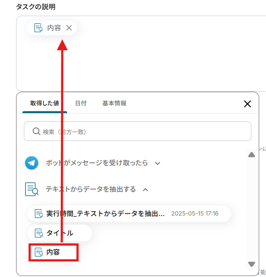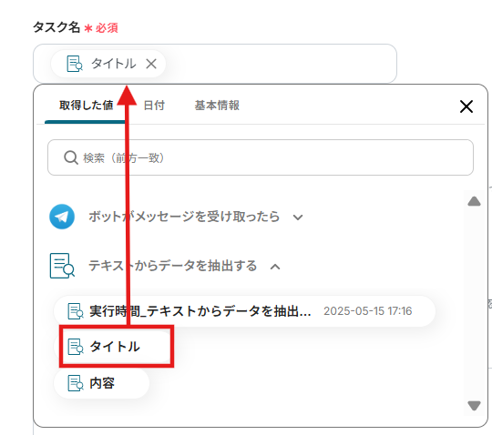 3.「タスク名」は入力欄をクリックし、先ほど取得したアウトプットから選択します。