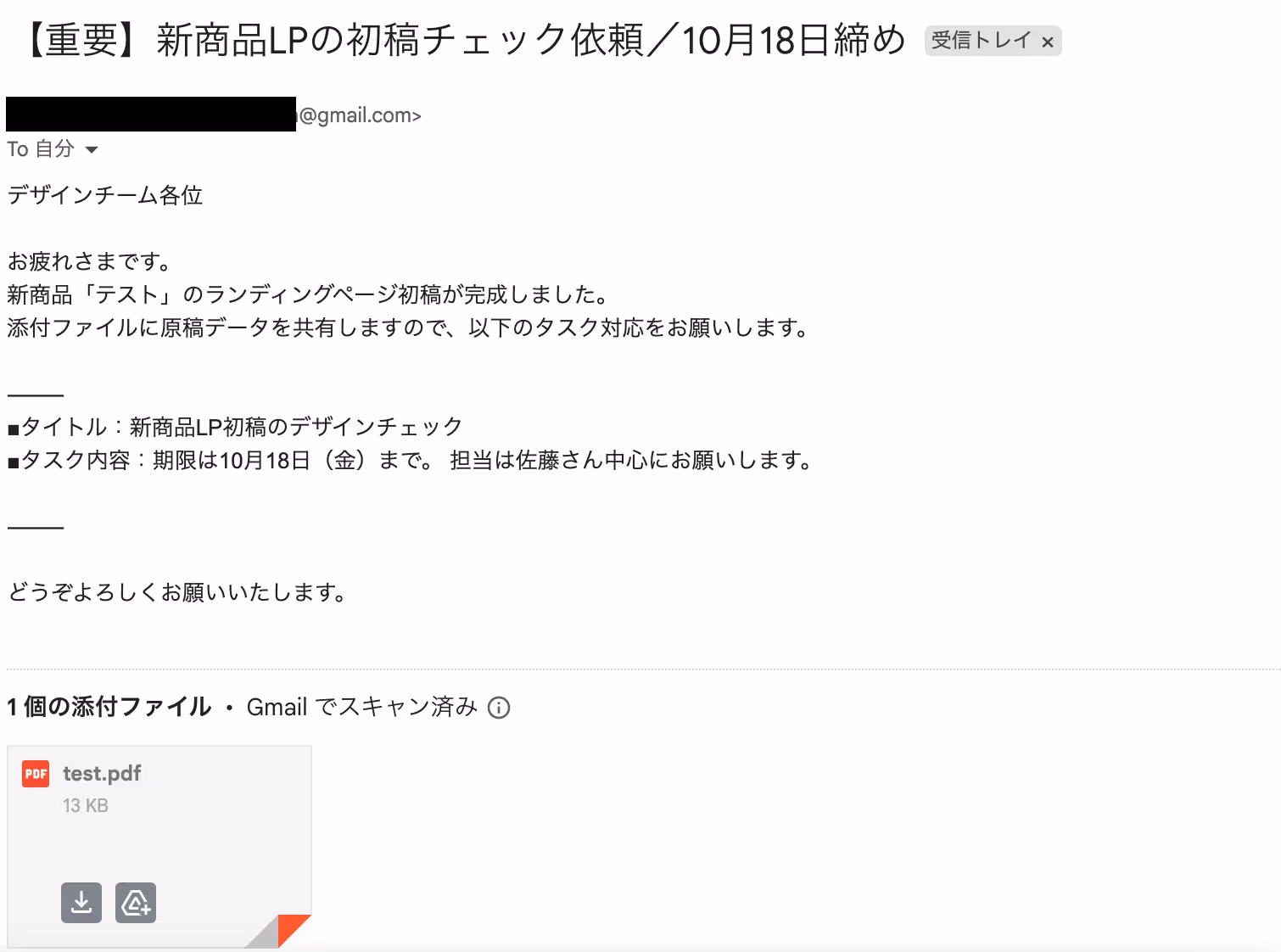 今回は、以下のメールを受け取った設定で進めていきます。キーワードは「重要」に設定しました。
