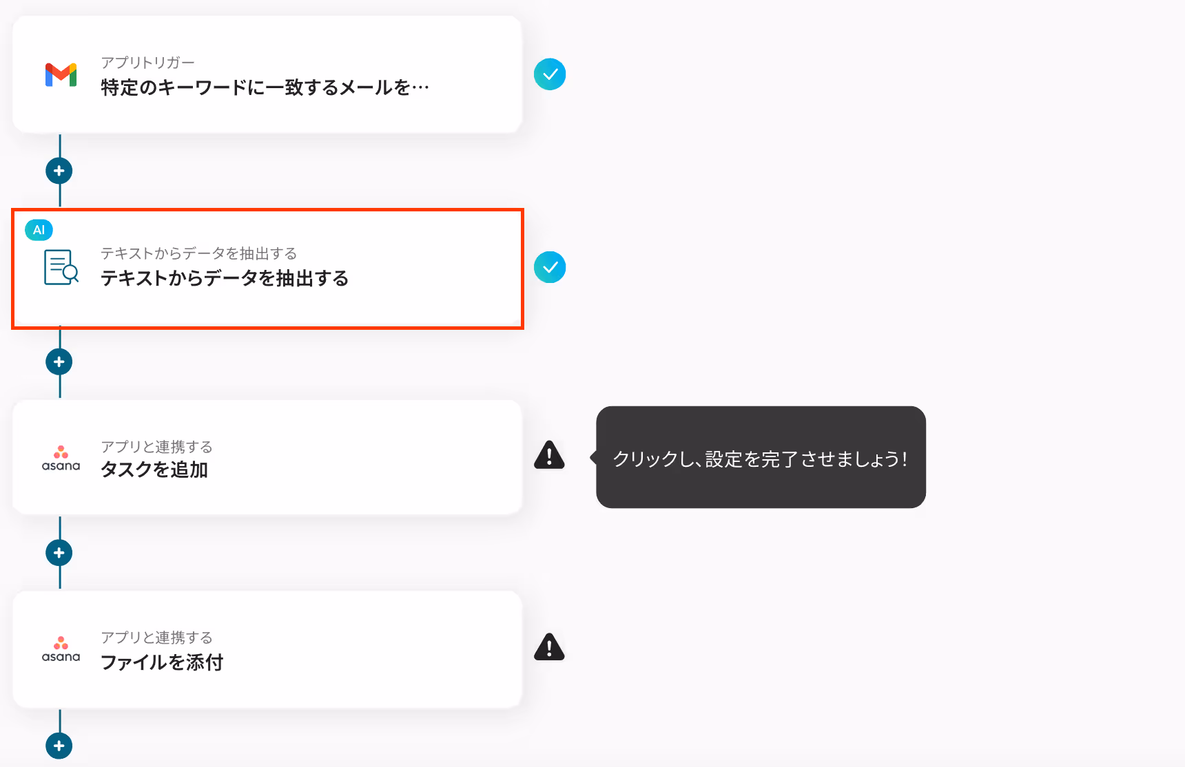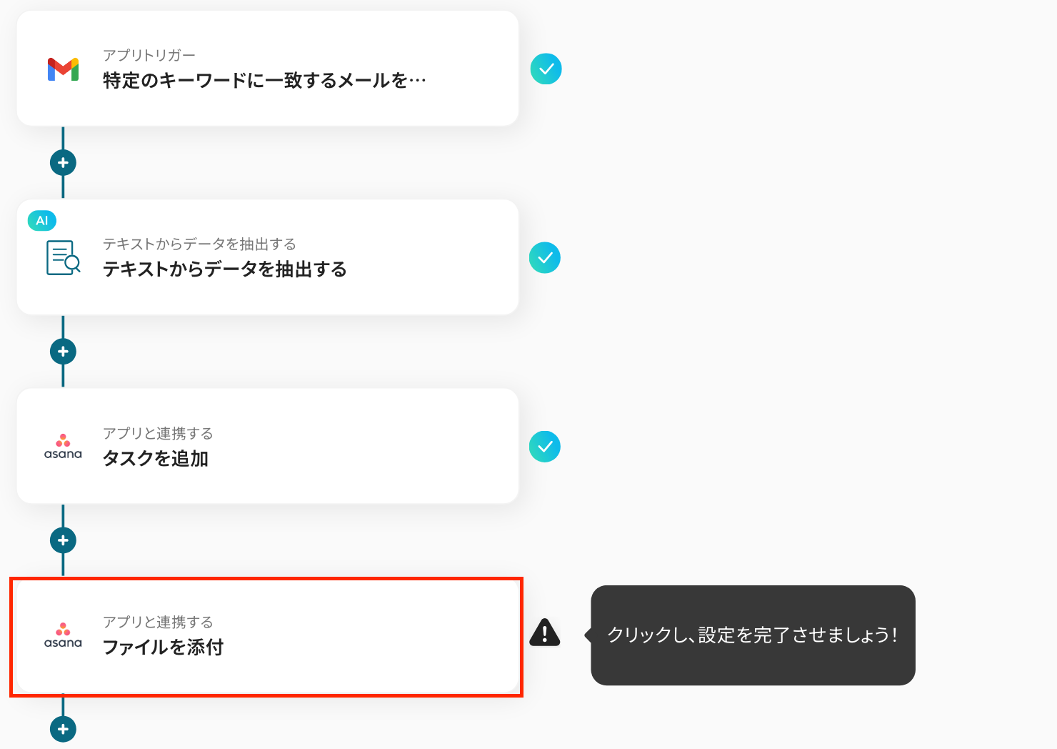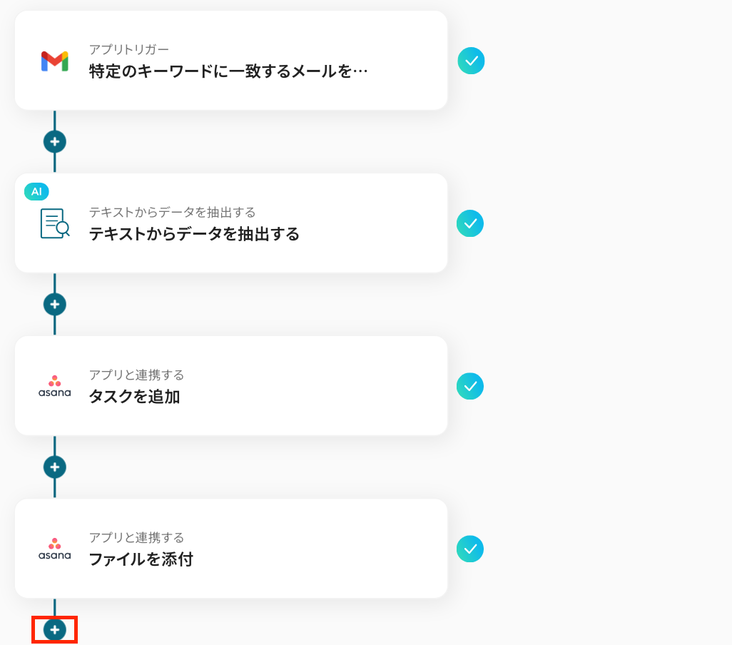 以上で、「Gmailで特定のキーワードに一致するメールを受信したら、Asanaへのタスク作成とファイル添付を自動化する」フローの完成です。お疲れ様でした!