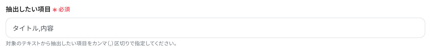 「抽出したい項目」:対象のテキストから抽出したい項目をカンマ(,)で区切り、指定。