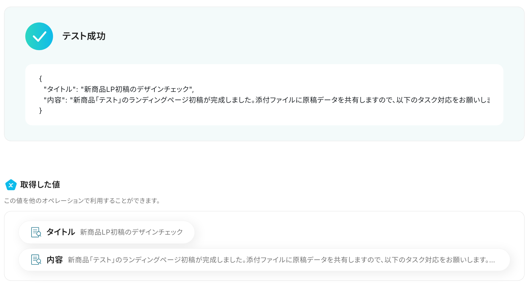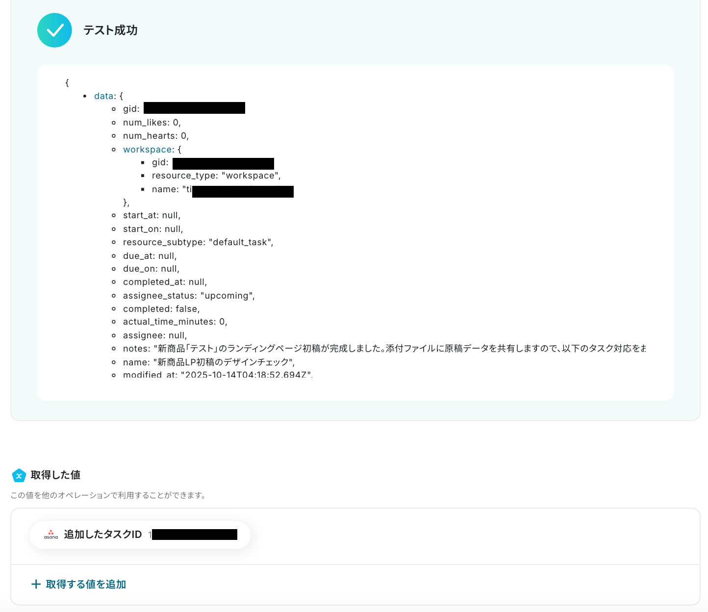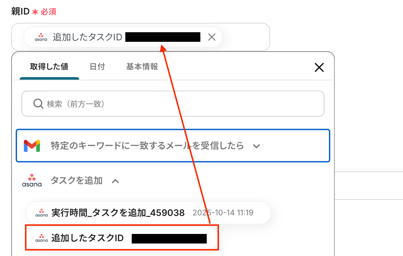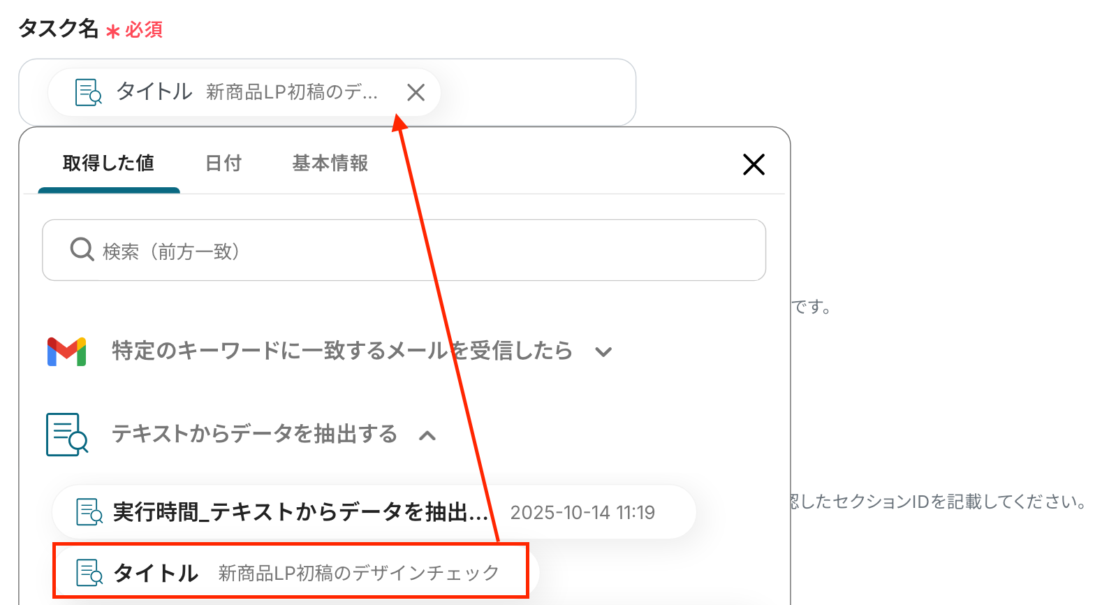 「タスク名」:入力欄をクリックし、表示される取得した値を引用してください。