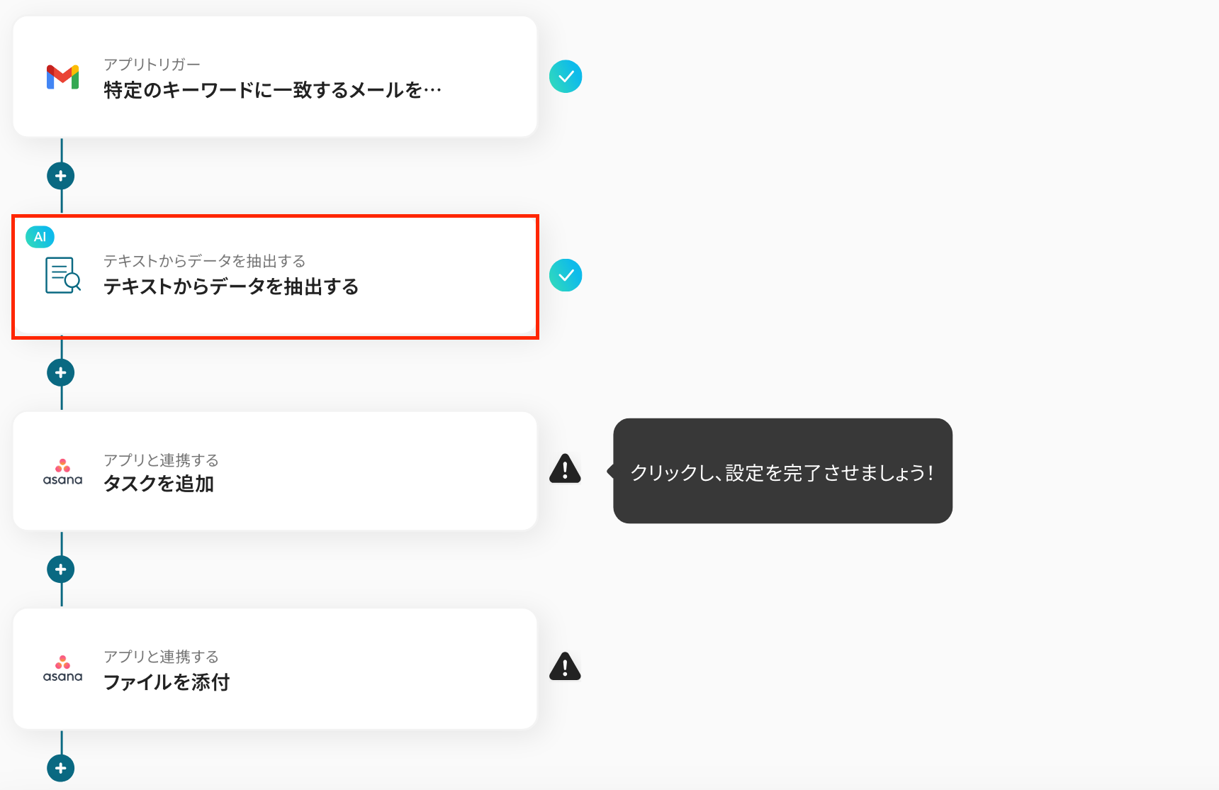 - Gmailのトリガー設定とテキスト抽出設定、Asanaのアクション設定