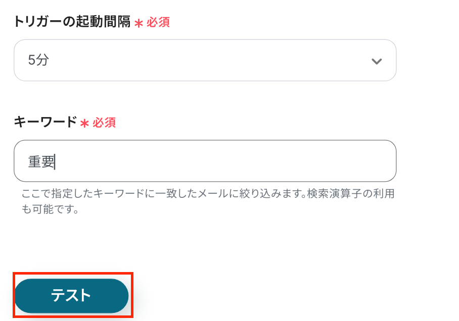 キーワード:先ほどテスト送信したメールの文章に含まれているキーワードを入力しましょう。キーワードには、演算子の利用も可能です。