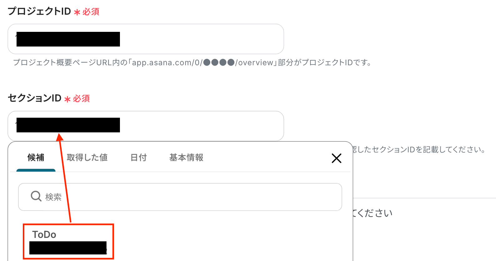 「プロジェクトID」・「セクションID」:入力欄をクリックして表示される候補から選択して設定しましょう。