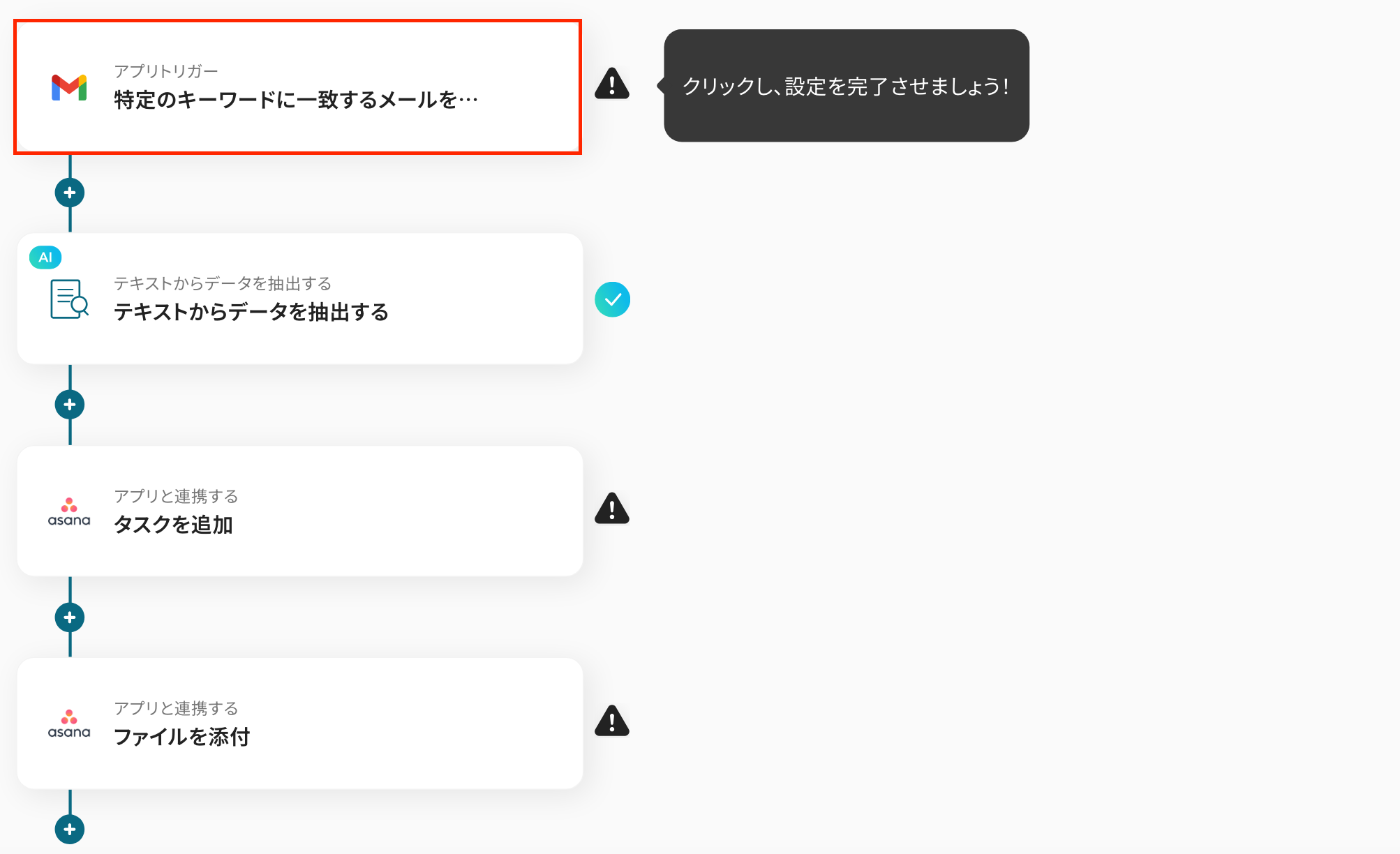 ここから「Gmailで特定のキーワードに一致するメールを受信したら、Asanaへのタスク作成とファイル添付を自動化する」フローを設定していきます。