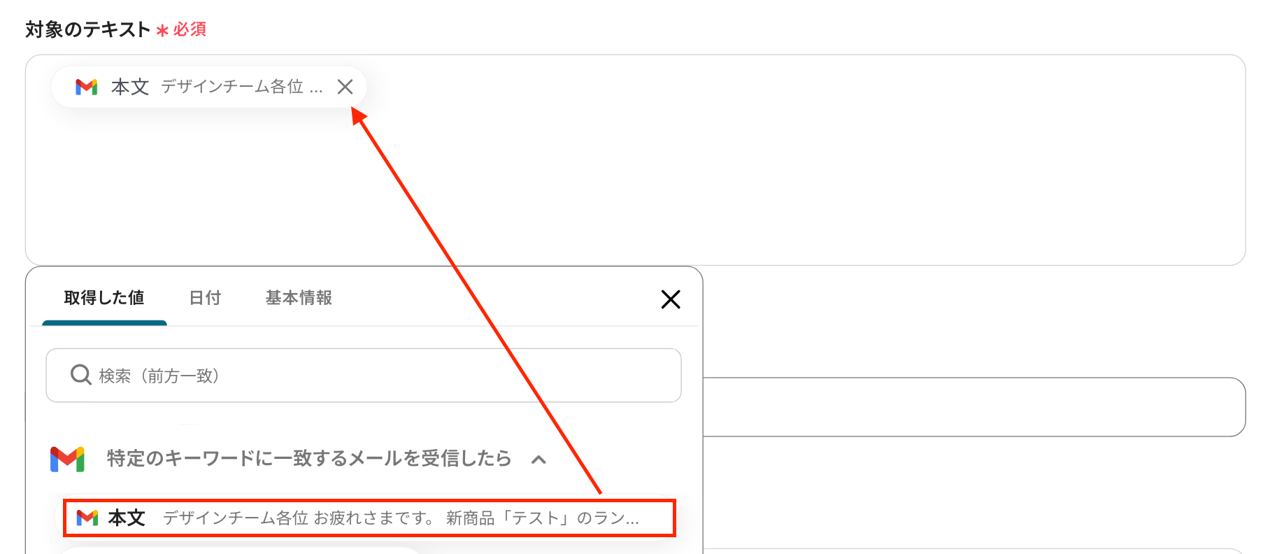 「対象のテキスト」:入力欄をクリックして表示される取得した値から「本文」を選択。