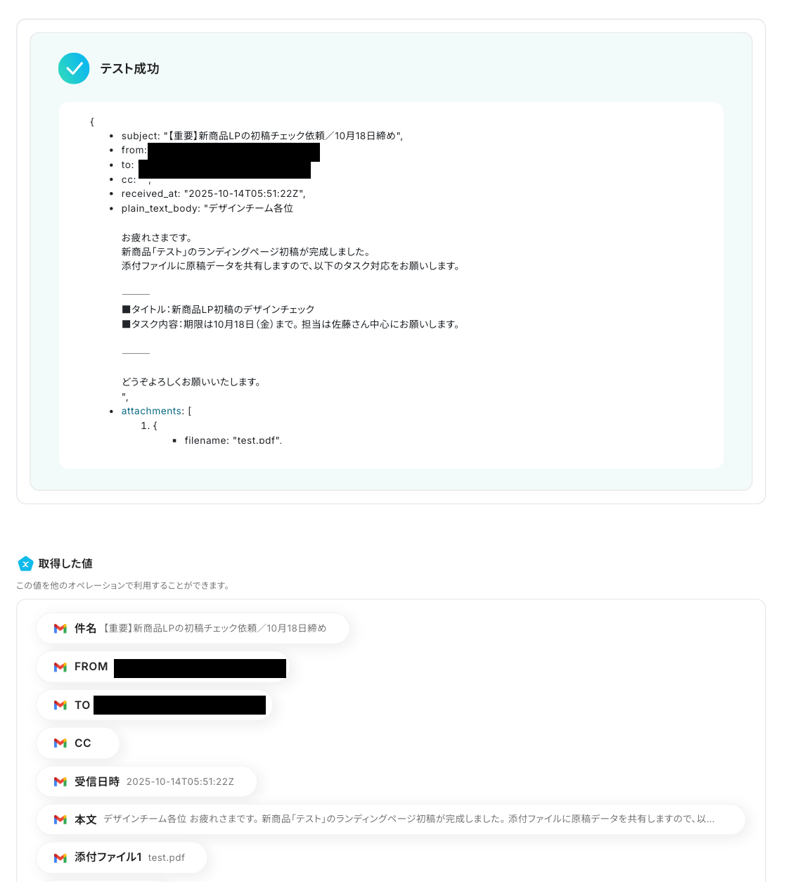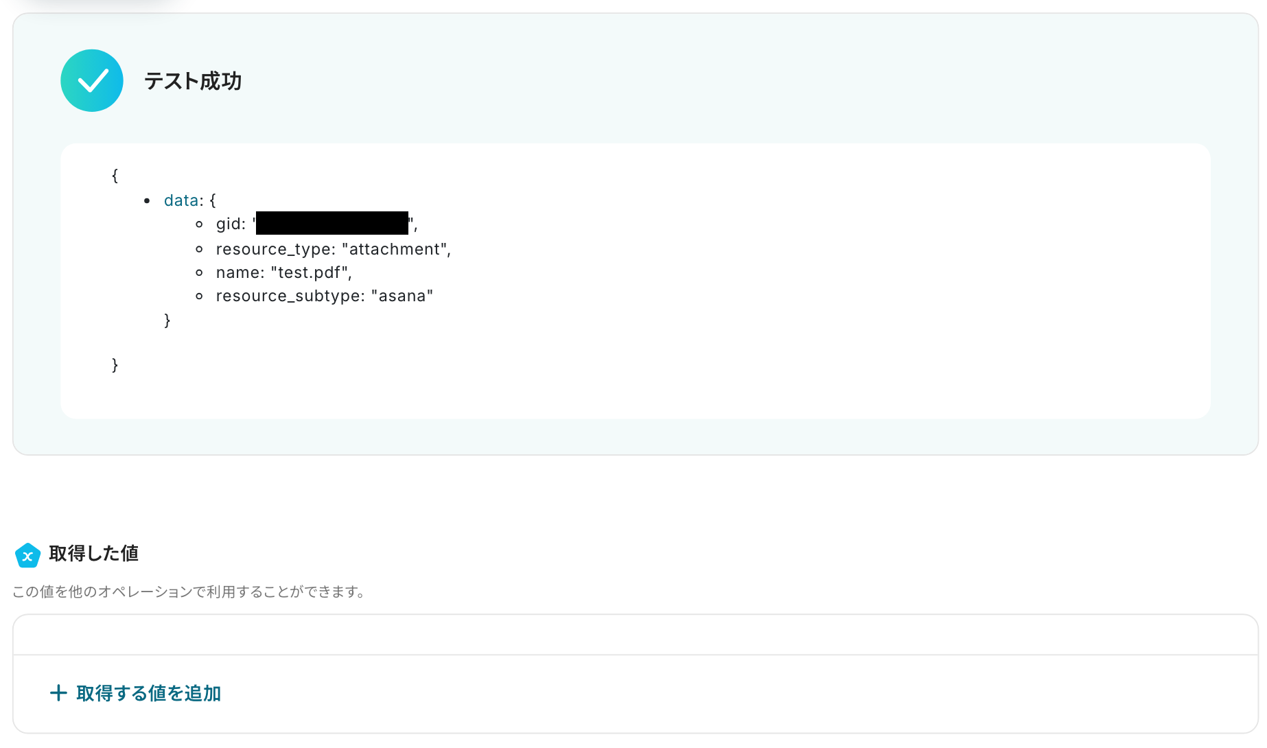 入力が完了したら、「テスト」をクリックしましょう。テストが成功すると、以下の画像のような取得した値が表示されます。