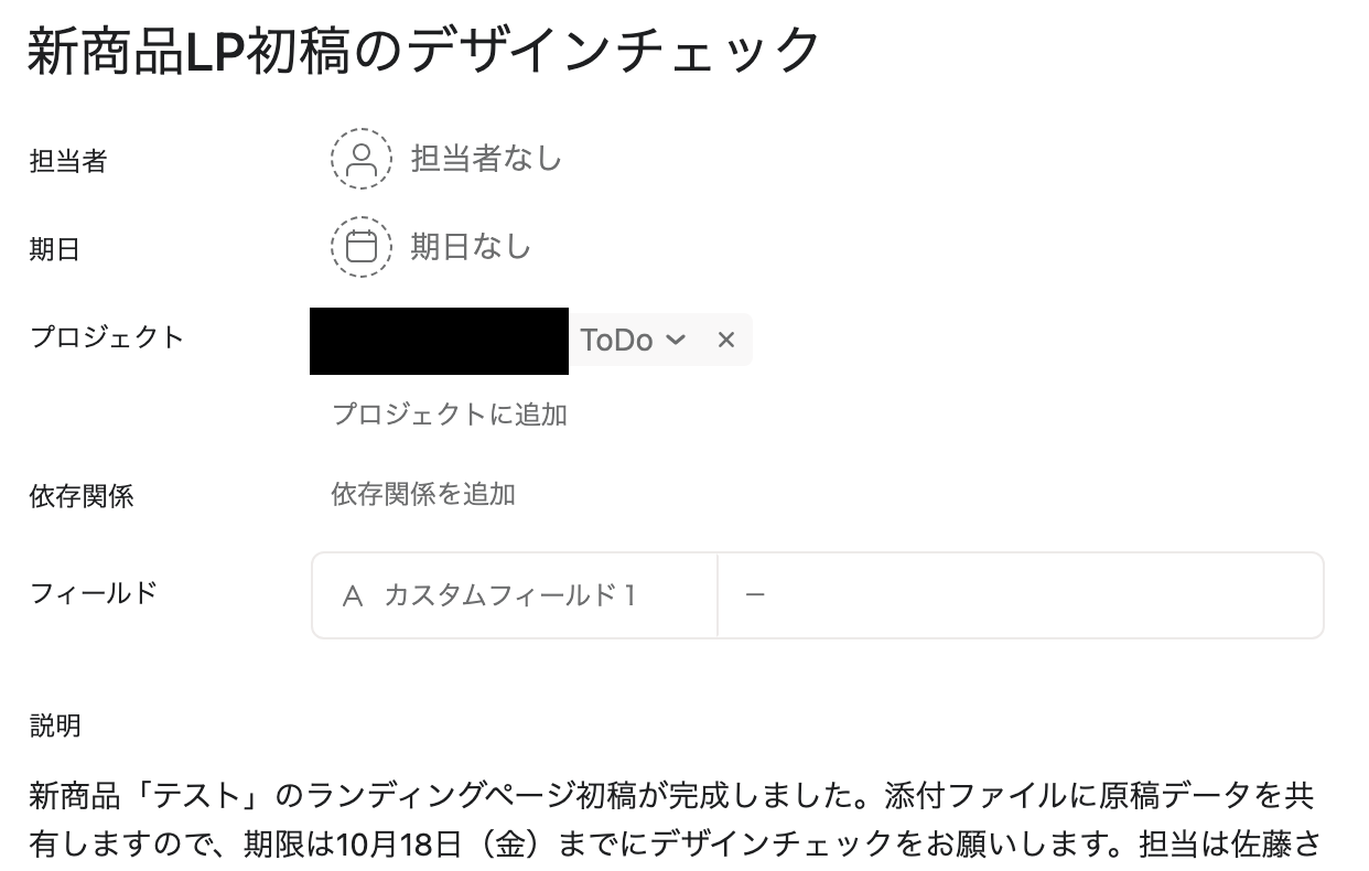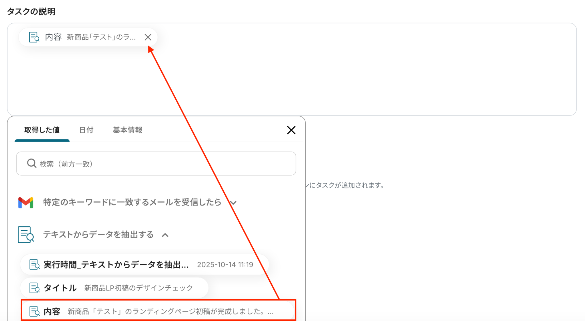 「タスクの説明」:入力欄をクリックして表示される取得した値を引用して設定しましょう。なお、直接文章を入力することも可能です。