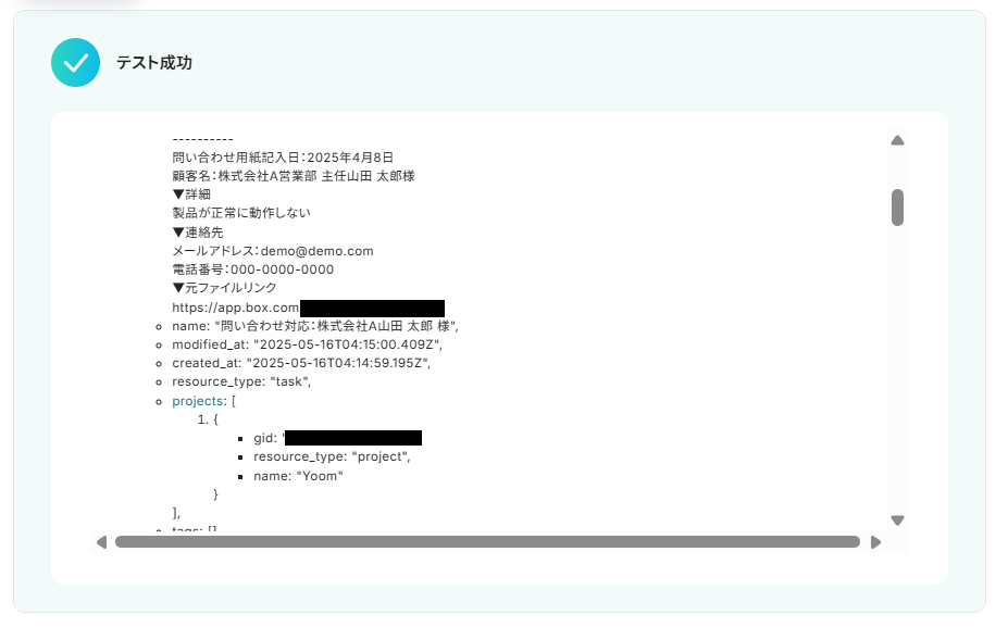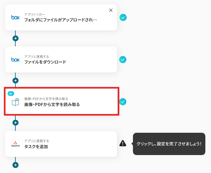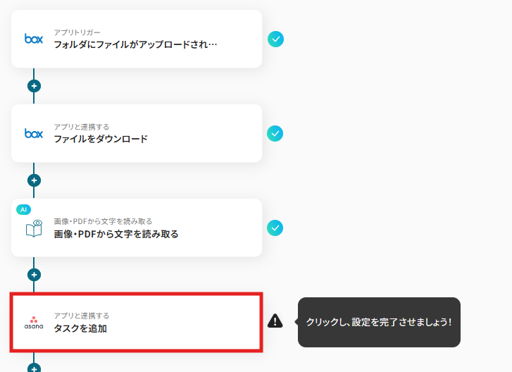 これで【Boxに格納されたファイルをOCRで読み取り、Asanaにタスクを追加する】というフローが完成です。
