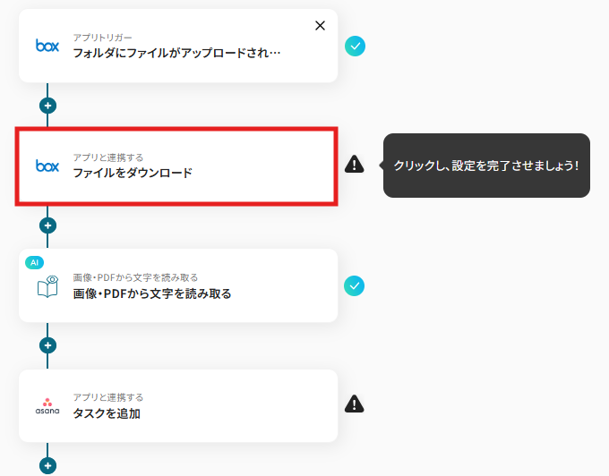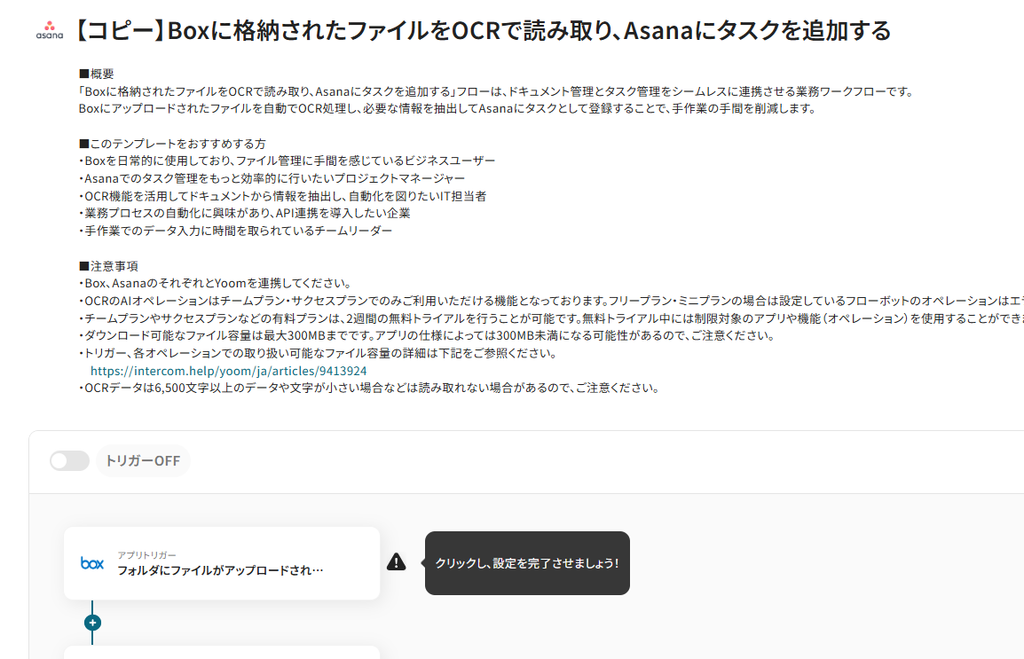 「Boxに格納されたファイルをOCRで読み取り、Asanaにタスクを追加する」フローは、ドキュメント管理とタスク管理をシームレスに連携させる業務ワークフローです。