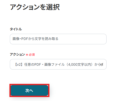 2) アクションはアクションは「任意のPDFや画像ファイルから文字情報を読み取る(5タスク)」が選択されていることを確認し、「次へ」をクリックします。