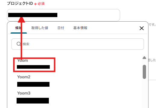 プロジェクトIDはボックスをクリックすると連携済みのIDが表示されるので、該当のプロジェクトを候補から選択してください。