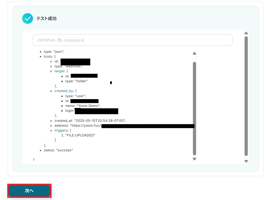 Boxでファイルをアップロード後に「テスト」をクリックしてください。