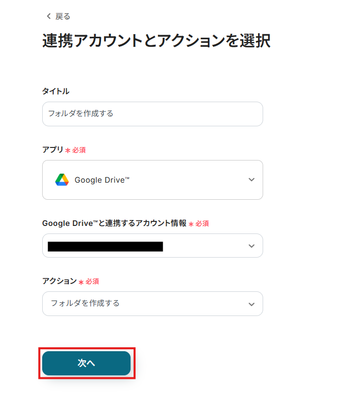 連携するアカウント情報には、ステップ1で連携したアカウント情報が反映されています。トリガーアクションはそのままにして、「次へ」をクリックしてください。