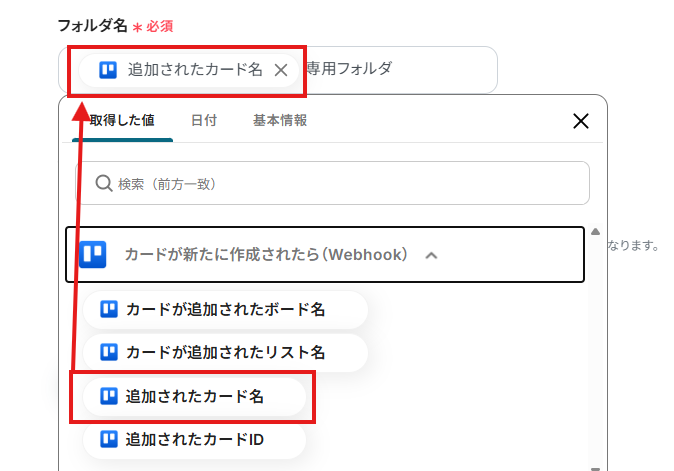 「フォルダ名」は、入力欄をクリックして表示されるアウトプット(取得した値)から選択してください。