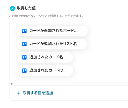※Trelloのアウトプット(取得した値)が空白のため、Trelloのアウトプットが表示されていませんが、値が入っていると表示されます。