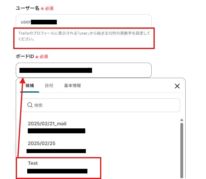 「ボードID」は、入力欄をクリックして表示される候補から選択してください。