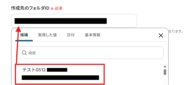 「作成先のフォルダID」は、入力欄をクリックして表示される候補から選択できます。