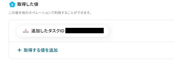 - 次に、オペレーションでAsanaの「タスクの詳細を取得」アクションを設定し、プルリクエスト作成に必要な情報を取得します。