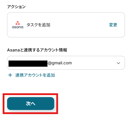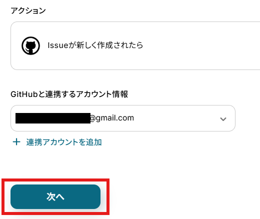 アクションはデフォルト設定のまま、アカウント情報は、連携したいアカウントが選択されているか確認してください。