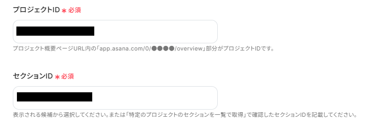 - Asana側では、登録先となるプロジェクトIDやセクションIDを任意で設定してください。