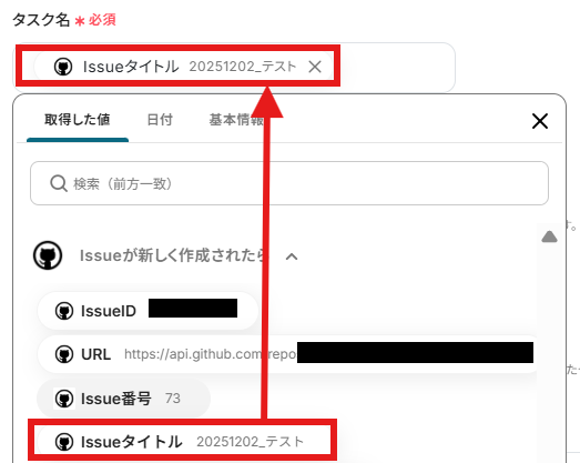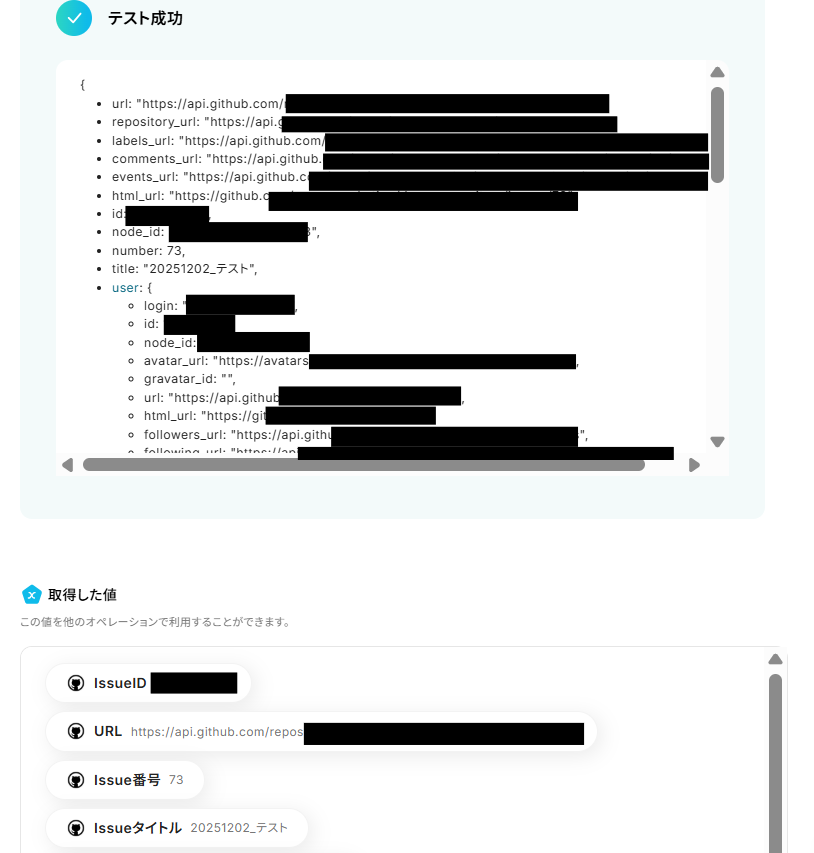 - 最後に、オペレーションでGitHubの「Issueを作成」アクションを設定し、取得した取引情報を基にIssueを作成します