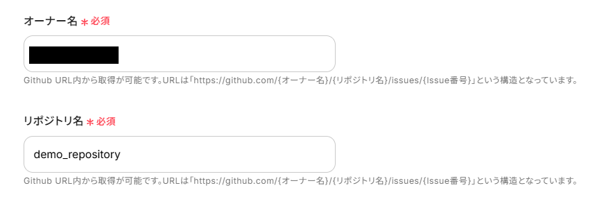 - GitHubでIssueを作成するアクションでは、対象となる任意のオーナー名とリポジトリ名を設定してください