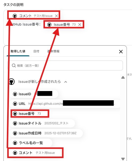 - GitHubのオペレーション設定で、自動でクローズしたいIssueのオーナー名、リポジトリ名、およびIssue番号を設定してください。Asanaのタスク情報からこれらの値を取得し、動的に指定することも可能です。