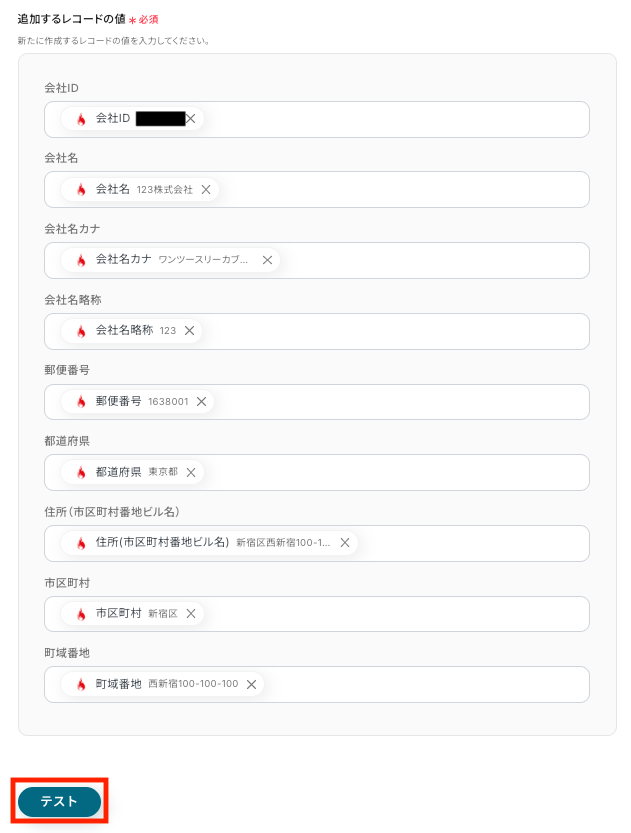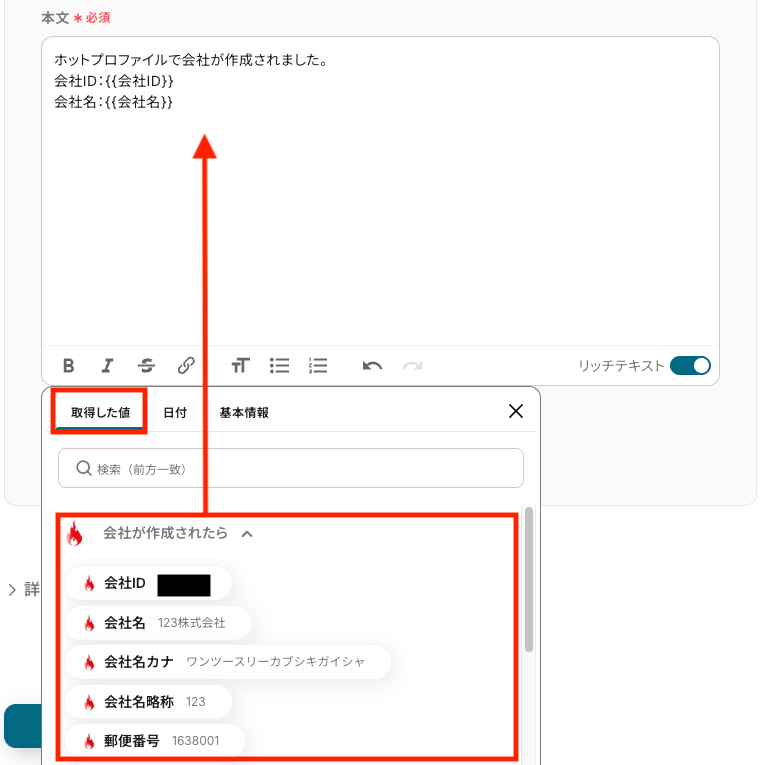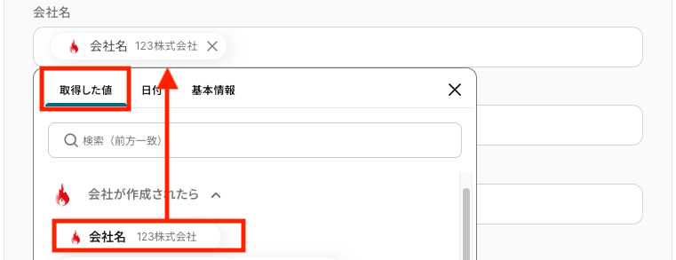 例えば、会社名を反映したいときは、入力欄をクリックして「取得した値」タブを開き、「会社が作成されたら」から「会社名」を選択してください。