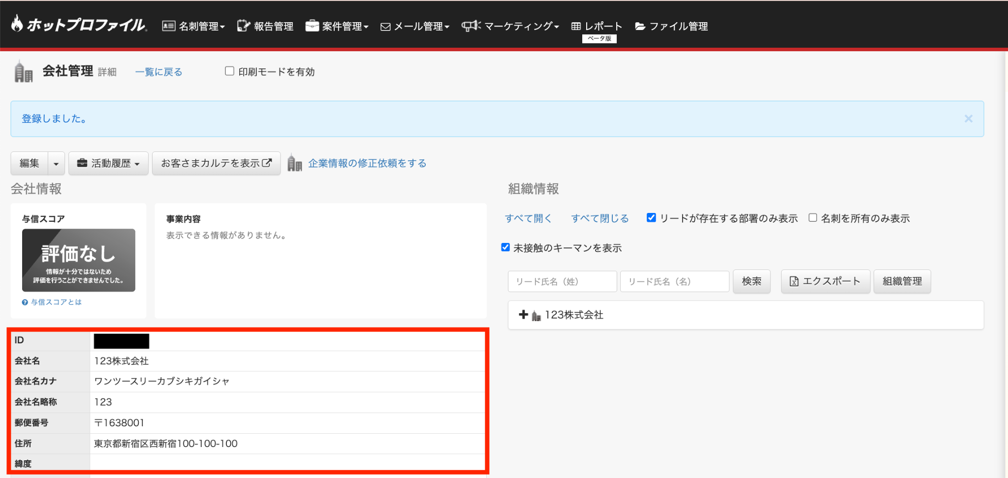 ここで一度ホットプロファイルを開き、テスト用に新しい会社情報を登録してください。