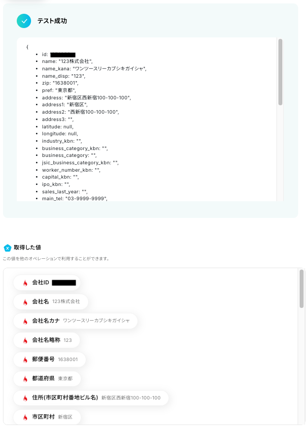 テストに成功すると、以下のように「取得した値」が表示されます。