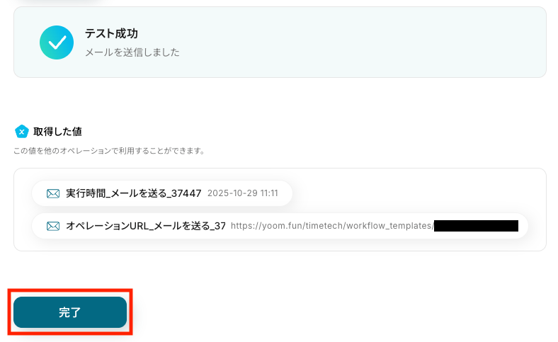 テスト完了後は、忘れずに完了をクリックしましょう。